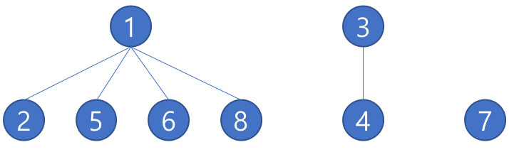 - 각각의 원소들이 어떤 원소들과 연결이 되어있는지 입력을 받는다고 가정하면(1-2, 2-5, 5-6, 5-8, 3-4 이런 방식으로) 아래와 같이 3개의 서로소 집합이 나올 수 있다.